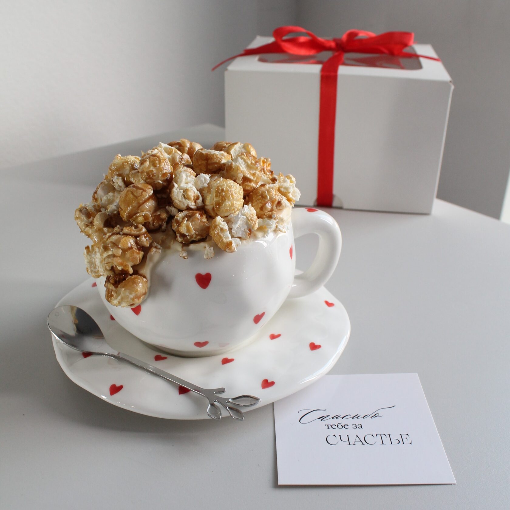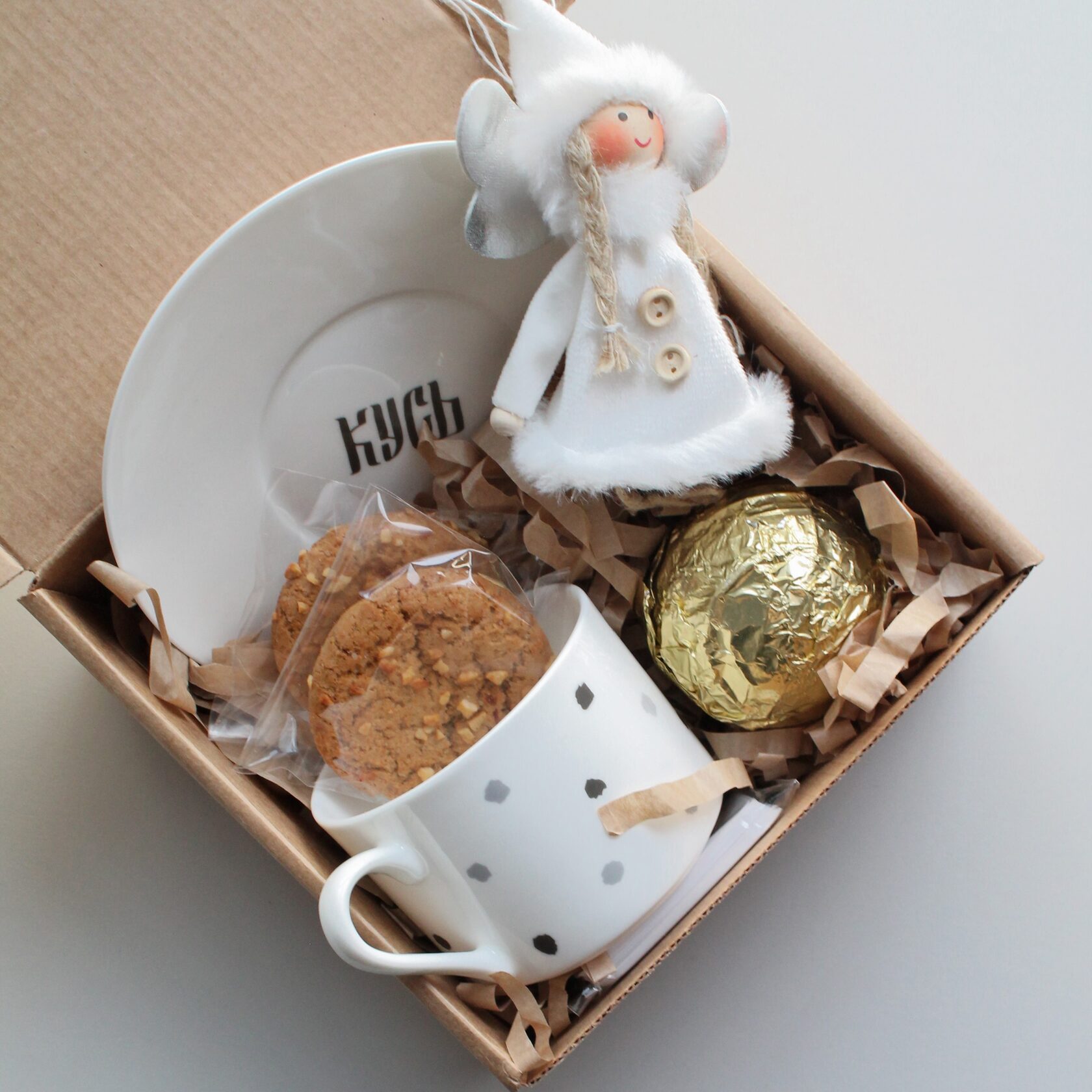 Встречайте набор для душевных вечеров, в который входит: — изысканная чашка с блюдцем из костяного фарфора с необычной надписью «кусь»; — какао-бомбочка с маршмеллоу для уютных посиделок; — домашнее ароматное печенье; — карточная игра для весёлых разговоров и улыбок; — милая игрушка-ангелочек для вдохновения.