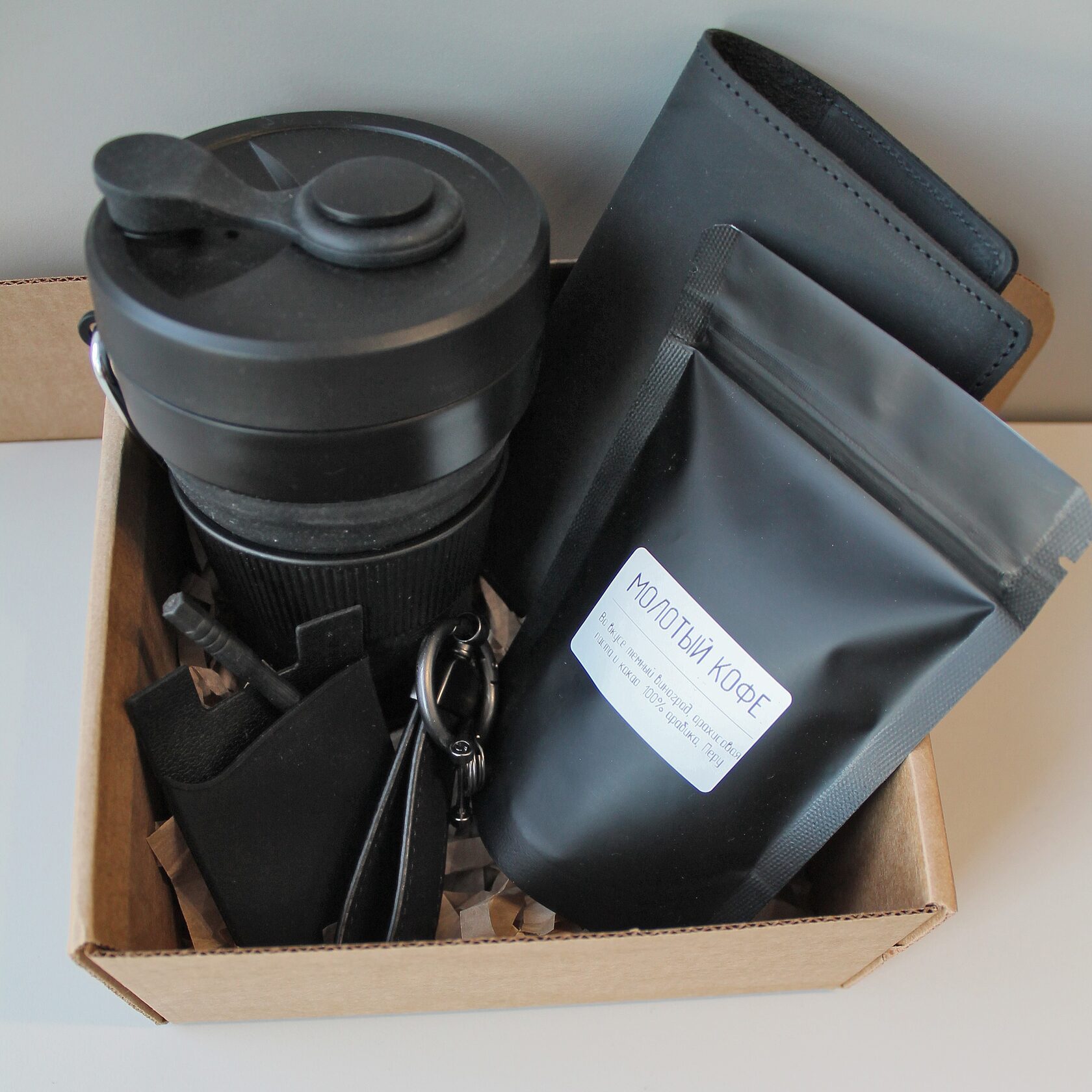 Этот стильный и практичный подарочный набор создан специально для мужчин, которые ценят комфорт и удобство в своих автомобильных путешествиях. В него входят: 1. Складной силиконовый стакан для горячих напитков. Его легко сложить и убрать в бардачок или дверь машины после использования. Устойчив к высоким температурам и легко моется, что позволяет наслаждаться горячими напитками в любом месте и в любое время. 2. Брелок для ключей – стильный и функциональный аксессуар из качественных материалов. 3. Картхолдер – практичное и элегантное решение для хранения карт. Компактный дизайн позволяет легко поместить картхолдер в карман или приклеить к телефону. 4. Обложка для паспорта из натуральной кожи – этот аксессуар не только защитит паспорт от повреждений, но и добавит стильный акцент в образ путешественника. Натуральная кожа придает обложке роскошный вид и долговечность, минималистичный дизайн без надписи на лицевой стороне 5. Молотый кофе, который можно заваривать как в кружке, так и в турке
